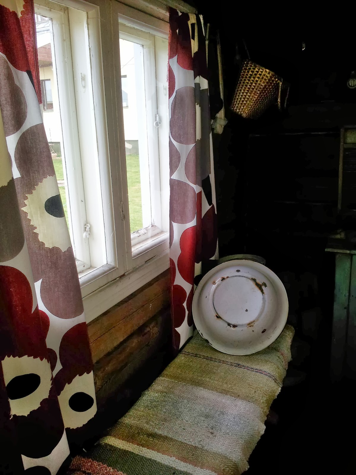 Ulkosauna tuli myös pestyä, viimeksi pesty perusteellisesti juhannukseksi. Vaihdoin saunakamariin verhot, ne joskus muinoin sitten kirpputorilta ostamani Marimekon Unikko-sivuverhot.